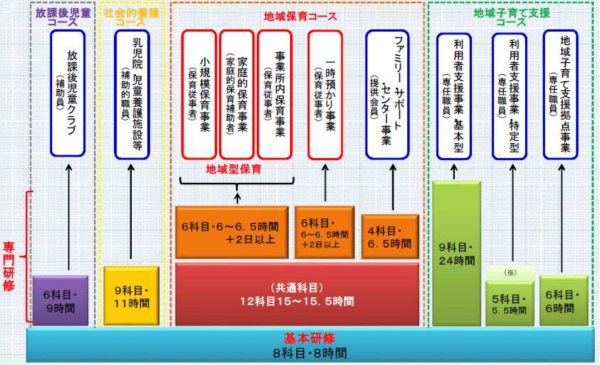 多様な保育や子育て支援分野に関しての必要な知識や技能等を修得し、小規模保育、一時預かり事業、放課後児童クラブ等において子育て支援の事業に従事する方の資質向上を目的とした研修です。